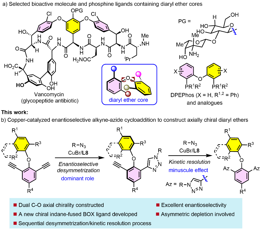 近年来,姚和权团队针对具有重要生物活性的药物分子片段和砌块,采用过渡金属催化去对称化策略,设计合成了多类手性分子骨架,取得了多项重要研究成果(Angew. Chem., Int. Ed.2023, 62, e202305518;Angew. Chem., Int. Ed.2023, 62, e202313404;Nat. Commun. 2021, 12, 6627;Nat. Commun.2020, 11, 2544; Angew. Chem., Int. Ed.2019, 58, 2884)。在此基础上,近期,该团队设计、开发了一类全新的C2-型轴对称手性双噁唑啉(BOX)配体,通过铜催化的不对称叠氮-炔环加成反应,首次实现了过渡金属催化的轴手性二芳基醚类化合物的不对称合成(图1b)。该研究不仅进一步拓展了过渡金属催化去对称化策略的应用范围,且为轴手性二芳基醚类化合物在药物研发、C-O轴手性配体的设计合成等领域的研究奠定了合成基础。
