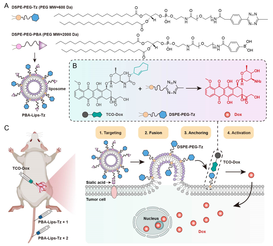 肿瘤细胞膜反应器的构建及其原位生物正交前药激活作用机理示意图