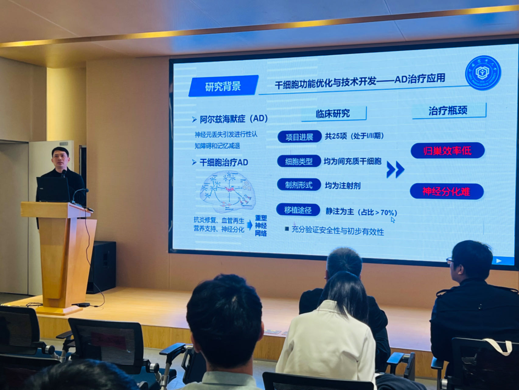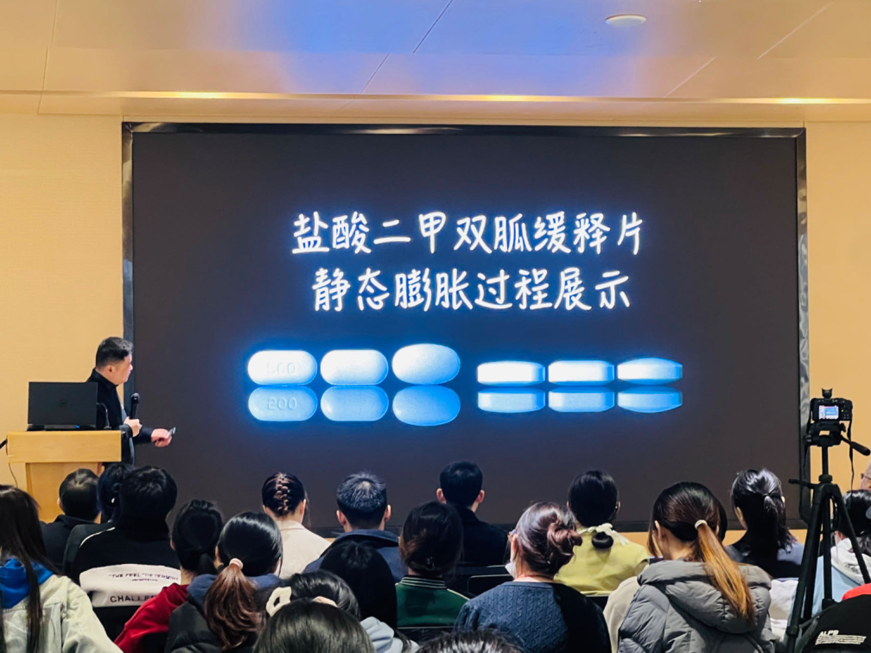 首先,四川大学华西williamhill官网邓黎副教授和公司williamhill官网药剂系副主任丁杨教授受邀先后作专家报告。邓黎副教授以“可视化技术用于固体制剂崩解释放特性的探索”为题,详细介绍并动画演示了如何利用可视化技术探索固体制剂崩解释放特性,阐述了药品研究创新的新方向,为在场观众呈现了一场视觉盛宴。丁杨教授以“干细胞疗法应用基础研究与转化思考”为题,围绕归巢效率低和神经分化难两个治疗瓶颈,介绍了研究团队在相关领域取得的重要成果。参会师生与两位专家进行了深入交流,现场气氛热烈。