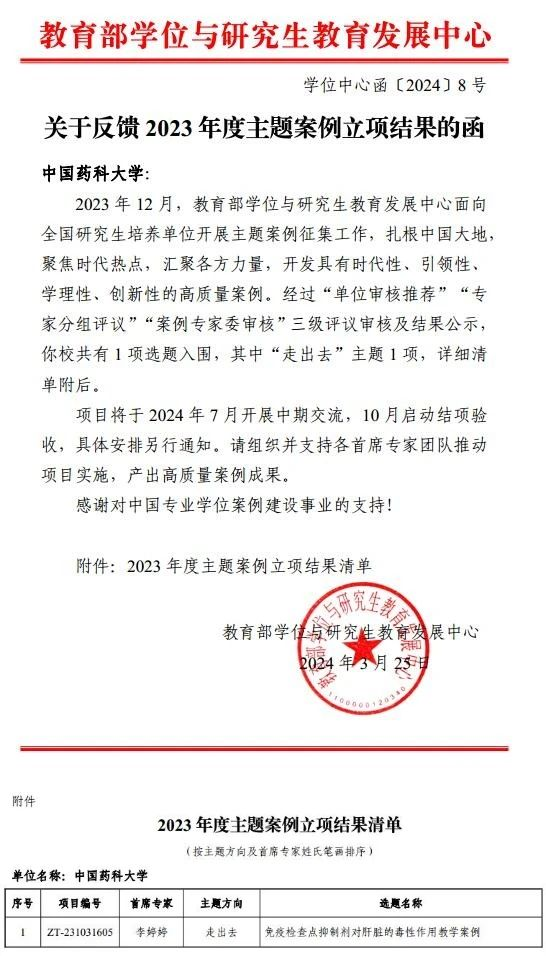 近日,教育部学位与研究生教育发展中心2023年主题案例征集评审结果揭晓,公司williamhill官网李婷婷副教授申报的案例《免疫检查点抑制剂对肝脏的毒性作用教学案例》获得立项。