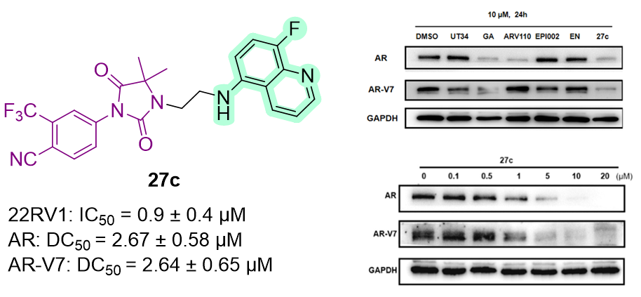 雄激素受体(AR)产生剪接变异体( AR-V7),是抗雄激素药物治疗去势抵抗性前列腺癌(CRPC)耐药的重要原因。现有AR拮抗剂和PROTAC降解剂主要靶向AR配体结合域(LBD),对LBD缺失的剪接变异体AR-V7失效。本课题组长期致力于靶向AR抗肿瘤药物研发,通过表型筛选、分子设计及优化策略,发现了一系列能有效降解AR/AR-V7的单价化合物(MW<500)。优选化合物27c能结合AR-NTD区,并选择性降解AR/AR-V7,而不影响核受体ER、MR;且在AR-V7阳性细胞系22RV1和移植瘤中均表现出优于恩杂鲁胺的抗肿瘤效果。本研究为靶向AR-V7的药物研发提供了新的思路和策略。