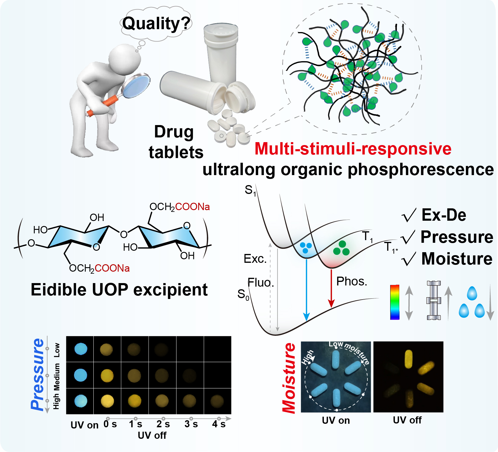 稳定性一直是药品的一个关键质量属性。在药品制造过程中,过程分析技术(Process Analytical Technology, PAT)是保证药品品质和稳定性的关键技术,能够大幅提高药品的生产效率和改善药品的质量。研究团队通过对药物制剂加工过程中常用的纤维素类辅料的构效关系进行系统性深入研究,首次报道了羧甲基纤维素钠(SCC)具备有机超长磷光特性以及激发波长、压力和水分等多重刺激响应特性。基于SCC的超长磷光特性开发的新型余辉成像过程分析技术,能够以极好的对比度(信背比高达120)实现片剂硬度的无损检测,同时对湿度的响应灵敏度比传统荧光模态高5.0倍以上。研究团队进一步通过设计实验证明了该技术对片剂中湿敏性药物在高湿度下转化为水合物导致溶出度降低的成功预警。此外,研究团队还将这一可食用、安全性好的药用辅料SCC单独设计成一个“on-dose”制剂标签,使其直接放置于任意类型的片剂表面,患者可通过肉眼可见的磷光强弱来判断每一个药片的品质。这项工作不仅加深了对辅料的结构与性质、功能的认识,而且还展示了先进的可视化技术在药品质量控制和改善患者安全用药方面的潜在应用,也为智能制造技术在药品及食品等领域的应用发展提供了新的思路。