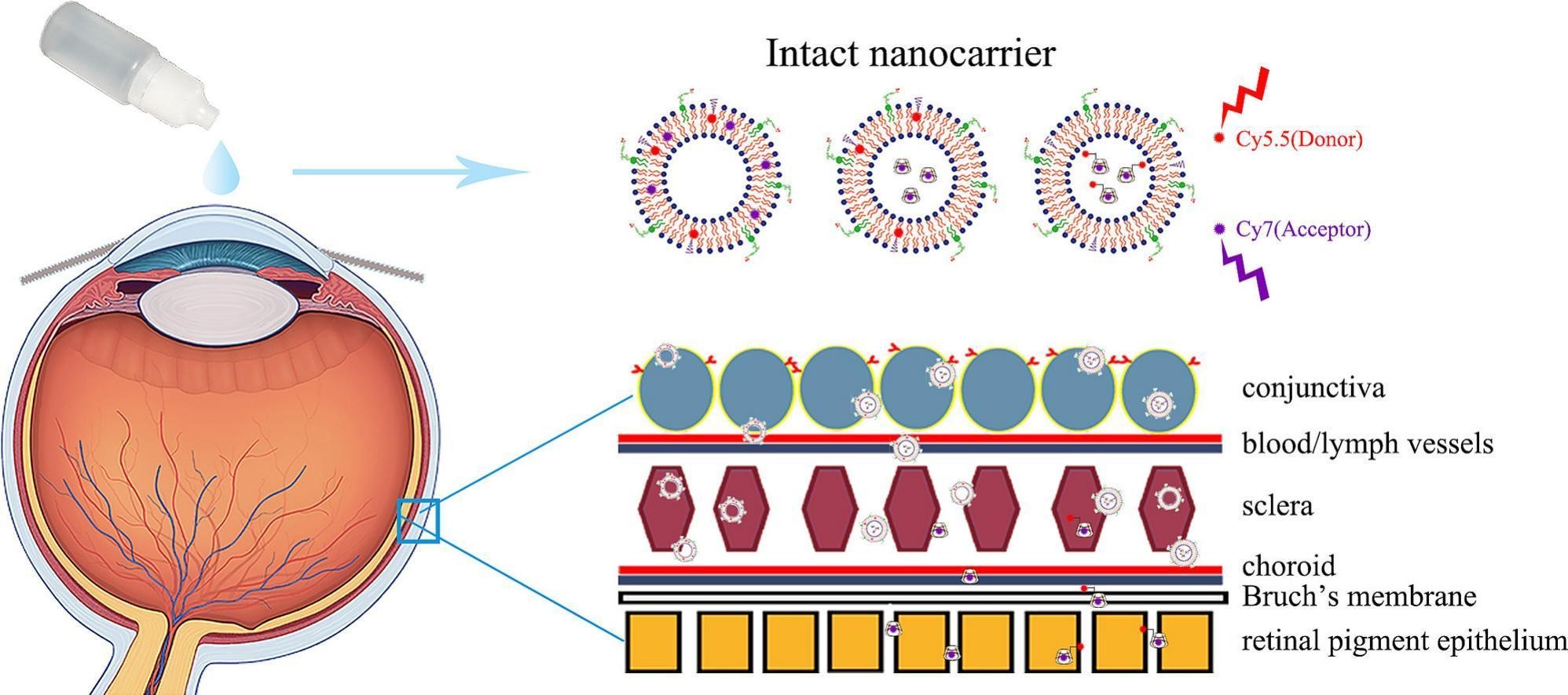研究纳米载体从眼表到眼后段的体内命运,监测载体递送过程中的结构完整性,一直是眼部药物递送系统领域的热点和难点。目前已发表的文章多通过基于测定FRET荧光效率的方法来探究纳米载体的体内命运,缺乏科学依据。本研究首次建立了基于测定完整纳米载体中荧光分子含量进行半定量研究的新方法,为基于FRET技术的药物递送系统的体内命运研究提供了新方法。基于课题组前期研究成果(Carbohydr Polym. 2023,315:120960. IF 11.2),本研究首先构建了不同形貌、组成和靶向特性的脂质体递药系统,使用近红外Ⅰ区菁染料Cy5.5/Cy7作为FRET对,通过荧光共振能量转移技术(FRET)结合小动物活体成像系统(IVIS),系统地对脂质体在结膜、巩膜和脉络膜-视网膜等不同组织中的结构完整性进行了研究。后制备了环糊精@脂质体双载体递药系统,对外载体脂质体和内部环糊精包合物从眼表到眼后段各个组织中的结构完整性进行了探究。最后以地塞米松为模型药物构建了主动靶向型羟丙-β-环糊精@脂质体双载体递药系统,并对其眼后段的递送效率进行了评价。