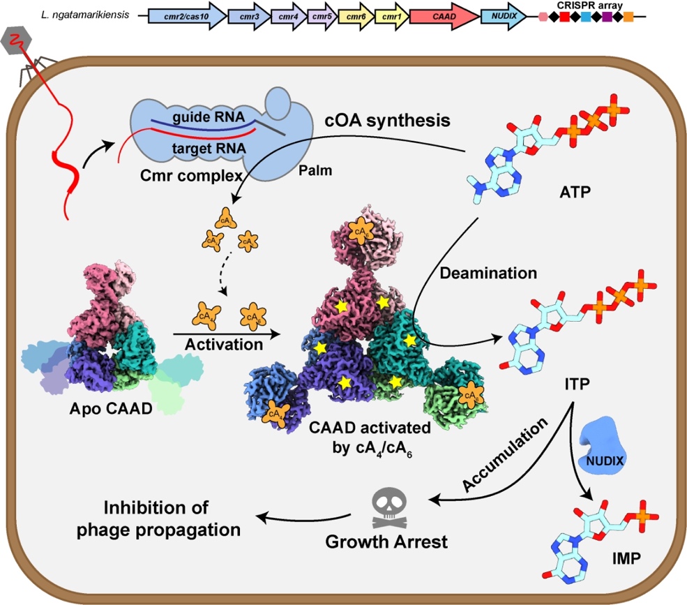CRISPR-Cas系统是原核生物中广泛存在的一种由RNA引导靶向外源遗传物质的核酸免疫系统。基于II型CRISPR-Cas9的基因编辑技术,获得2020年诺贝尔化学奖,并在生物医药等诸多领域产生了革命性的影响。而III型CRISPR-Cas系统是目前发现的所有CRISPR-Cas系统中最复杂的一类系统,阐明其作用机制具有重要的科学意义和潜在的应用价值。不同于其余Cas系统直接靶向并切割外源核酸,III型CRISPR-Cas系统识别外源核酸后会合成第二信使环化腺苷(cAn)来激活下游效应核酸酶的非特异性切割活性,从而实现免疫。但该团队前期通过生物信息学分析挖掘到一类III型CRISPR-Cas下游缺失了广泛分布的核酸酶模块,取而代之的是一个融合了第二信使识别结构域的脱氨酶CAAD,以及一个可能降解核苷的水解酶Nudix。表明该类系统的作用机制可能完全不同于已知的通过切割核酸实现免疫的CRISPR-Cas系统。鉴于合成环化核苷酸第二信使和腺苷脱氨分别在人源核酸免疫系统cGAS-STING和ADAR中存在,该团队大胆推测这类系统很可能是通过核苷酸代谢来实现其免疫效应。为了证明这一假设,团队成员通过体外重组,首先证明该系统效应复合物Cmr识别外源核酸后会利用ATP为底物合成cA3/cA4/cA6三种环化腺苷。其中cA4和cA6可做为第二信使特异性激活CAAD的脱氨酶活性,将ATP转变成ITP, 迅速导致ATP耗竭从而抑制被感染细菌的生长。但ITP的蓄积往往会导致较强的细胞毒性,团队进一步证明了水解酶Nudix可特异性地将ITP降解成IMP,并通过这一解毒效应恢复细菌生长。为了阐明cA4/cA6如何激动CAAD并将ATP脱氨生成ITP的分子机制,团队利用冷冻电镜捕捉到了CAAD从无活性到被激活过程中一系列的高分辨率三维结构,直接观察到并证实了其激活过程中存在协同效应。该项研究发现了核酸免疫系统中一条全新的核苷代谢-免疫调控-抗病毒通路,并阐明了其具体的分子机制,为开发III型CRISPR系统作为应用工具打下重要的理论基础。