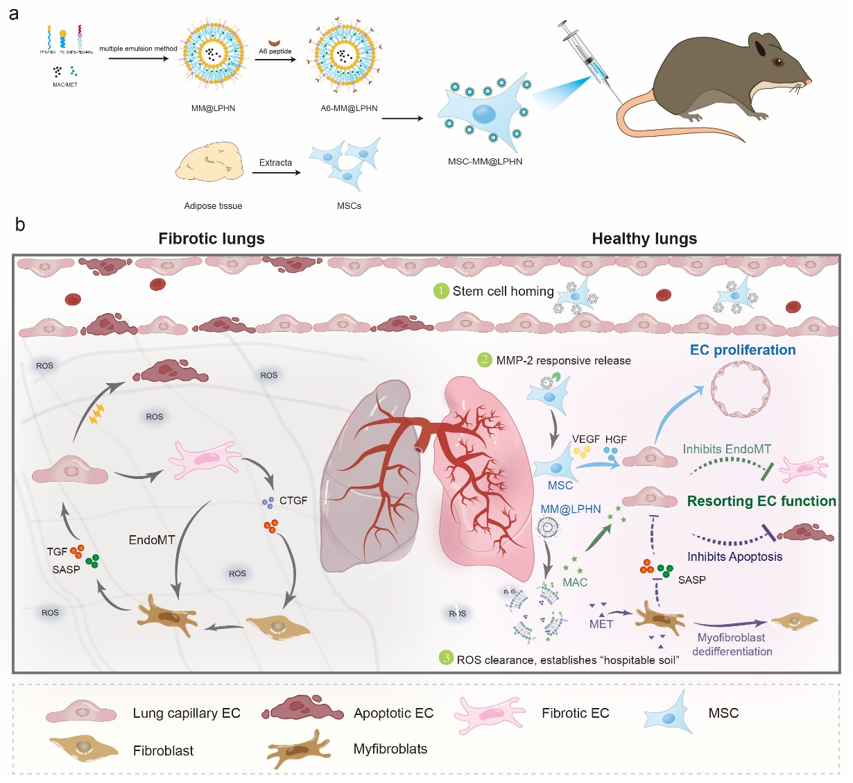 肺纤维化是一种进行性疾病,表现为呼吸系统损伤和肺组织功能修复障碍。肺血管生态位通过血管分泌因子在调节肺泡再生中起着至关重要的作用,然而肌成纤维细胞和血管内皮细胞之间的恶性串扰导致纤维化区域肺毛细血管的显著缺失,加剧肺纤维化进程。针对这一问题,该团队基于前期干细胞工程化技术(Sci Adv, 2020, 6: eaba3167;Sci Adv, 2023, 9: eadg5358)的基础上,开发了一种多功能工程化间充质干细胞(MSC-MM@LPHN),通过MSC膜表面锚定脂质聚合物纳米粒递送药物诱导肌成纤维细胞去分化,减少内皮细胞损伤因子的分泌,以及抑制血管内皮细胞向纤维化表型转化,从而恢复血管内皮细胞功能;同时结合MSC分泌生长因子促进血管生成作用,重塑纤维化区域正常血管结构,促进肺组织再生并逆转肺纤维化。