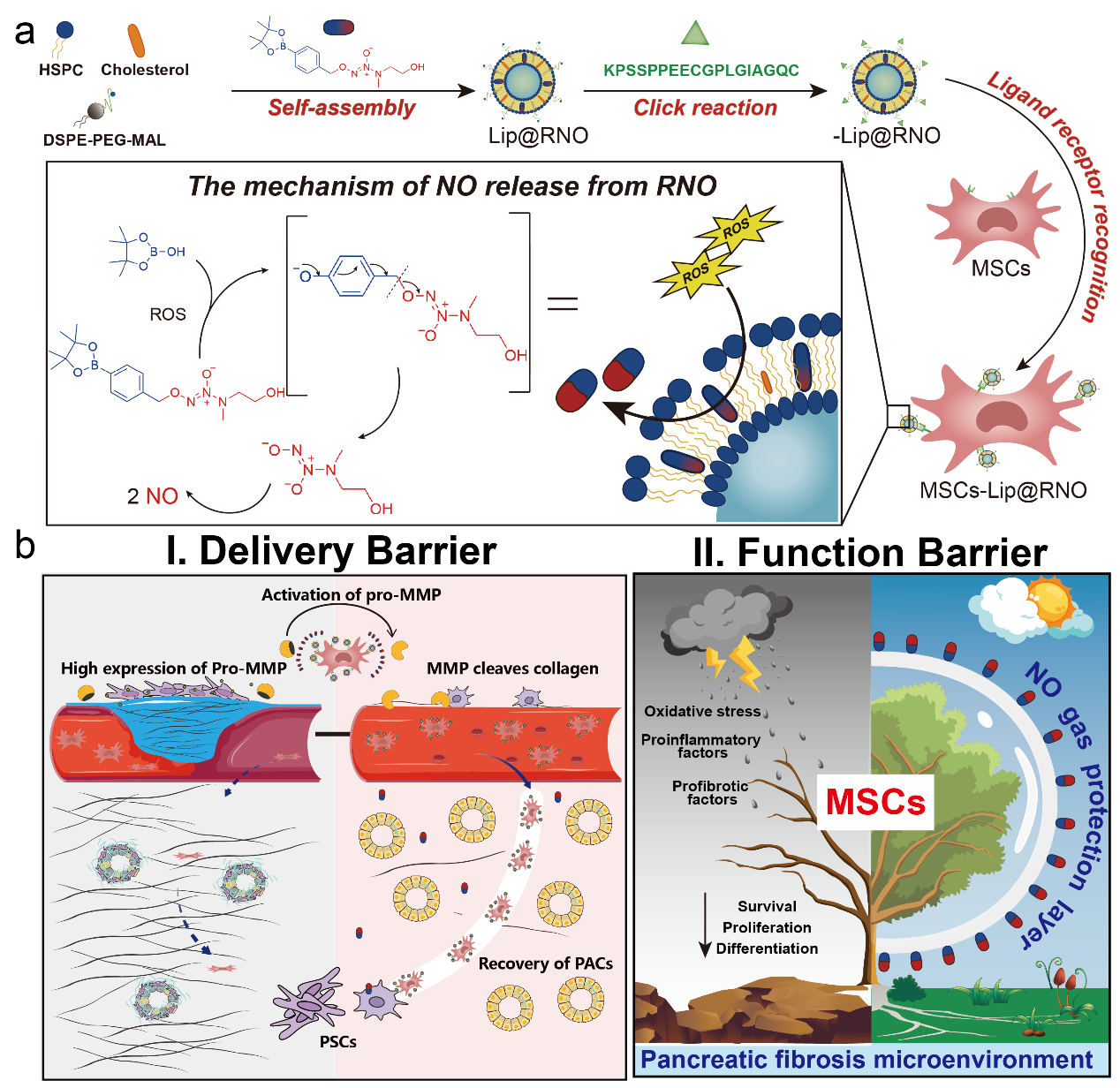 胰腺纤维化是慢性胰腺炎的独特组织病理学特征,表现为正常胰腺实质组织结构丧失,被纤维胶原取代。针对这类以组织修复为病症的疾病,通过具有自我更新、定向分化等功能的干细胞药物进行疾病干预是潜在的治疗手段。该团队前期发现干细胞用于纤维化治疗存在两大挑战:(1)干细胞因其尺寸较大,在纤维胶原层的渗透能力受限,难以定向迁移到病灶深处(Adv Drug Deliv Rev. 2023; 200: 115051);(2)纤维化的恶劣微环境造成干细胞在损伤部位迅速凋亡失活,削弱疗效(J Control Release. 2024; 365: 981-1003)。因此,该团队开发一种一氧化氮脂质体嫁接的工程化MSC,通过调节胶原纤维缓解血管压迫,推动干细胞在胰腺组织分布并增强干细胞体内活性,提高治疗效果。