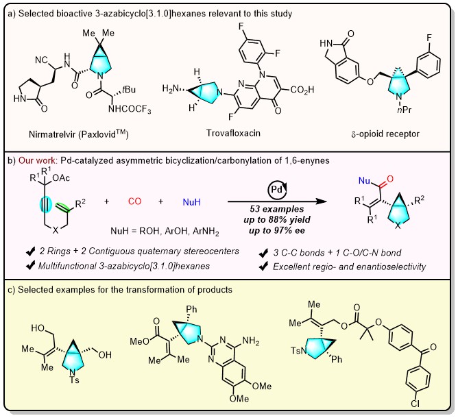 近日,国际著名期刊Angewandte Chemie International Edition(IF:16.823)在线发表了公司williamhill官网林爱俊/姚和权团队题为“Pd-Catalyzed Asymmetric 5-exo-trig Cyclization/Cyclopropanation/Carbonylation of 1,6-Enynes for the Construction of Chiral 3-Azabicyclo[3.1.0]hexanes”最新科研成果。2020级博士研究生李秋雨和2019级硕士研究生张云初为本论文共同第一作者,林爱俊教授、姚和权教授为本文共同通讯作者,williamhill为本文唯一通讯单位。
