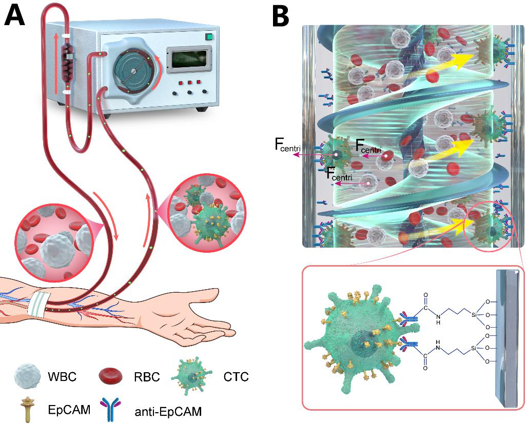 Tumour metastasis has become the main cause of about 90 % of cancer-related deaths, and circulating tumour cells (CTCs) are the vital component in the metastatic process, so as an important biomarker for non-invasive clinical diagnosis and prognostic assessment, the detection and clearance of CTCs are important in predicting overall and progression-free survival of cancer patients. However, existing techniques for the isolation and detection of CTCs are limited to small volumes of blood samples, which fail in full reflection of CTCs’hematological distribution throughout the body. Inspired by hemodialysis devices, Prof. Hulin Kang's team has developed a medical device to specifically remove circulating tumor cells in whole blood to achieve effective purification of circulating tumor cells. This study is published in Biosensors & Bioelectronics,2023,232:115292, under the title A novel whole blood purifier for efficient capture and separation of circulating tumor cells. A novel whole blood purifier for efficient capture and separation of circulating tumour cells. Associate Professor Xing Lei, Wang Xing (M.S. Student of Class 2021), Mingtao Yu (M.S. Student of Class 2022) and He Yujing (PhD Student of Class 2019) are the co-first authors. Prof. Jiang is the independent corresponding author and CPU is the unique correspondence affiliation of this article.