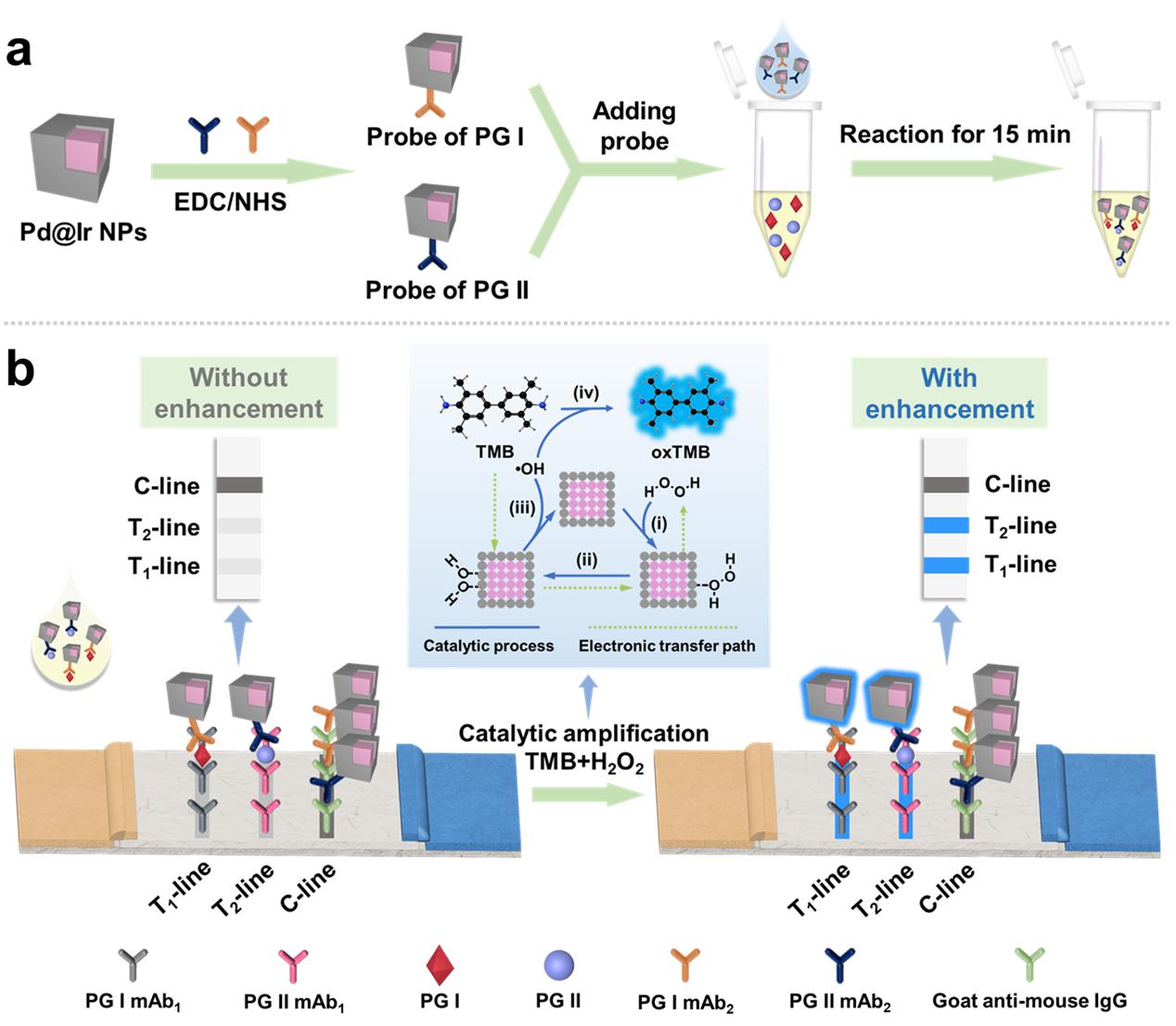 针对上述问题,研究团队使用了一种比色信号的放大策略,即双金属纳米酶介导的原位催化报告分子沉积(BN-ISCRD),用于LFIA以实现超灵敏检测癌症生物标志物。由于两种金属的协同或相加作用,双金属纳米酶(Pd@Ir NPs)表现出比Pd NPs和Ir NPs更优异的类过氧化物酶活性。基于此,将其作为标记材料应用于LFIA,通过原位催化报告分子沉积,以实现比色信号的放大,提高检测灵敏度。将该方法应用于检测胃癌标志物(PG I和PG II),信号放大后裸眼检测限可达10 pg/mL,灵敏度提供了200倍;同时,成功地从36个临床血清样本中鉴别出8个胃癌阳性样本,与临床方法的检测结果一致。这种BN-ISCRD策略将新型纳米材料与生物传感技术结合,为构建超灵敏的即时检测平台提供了一种新方法。