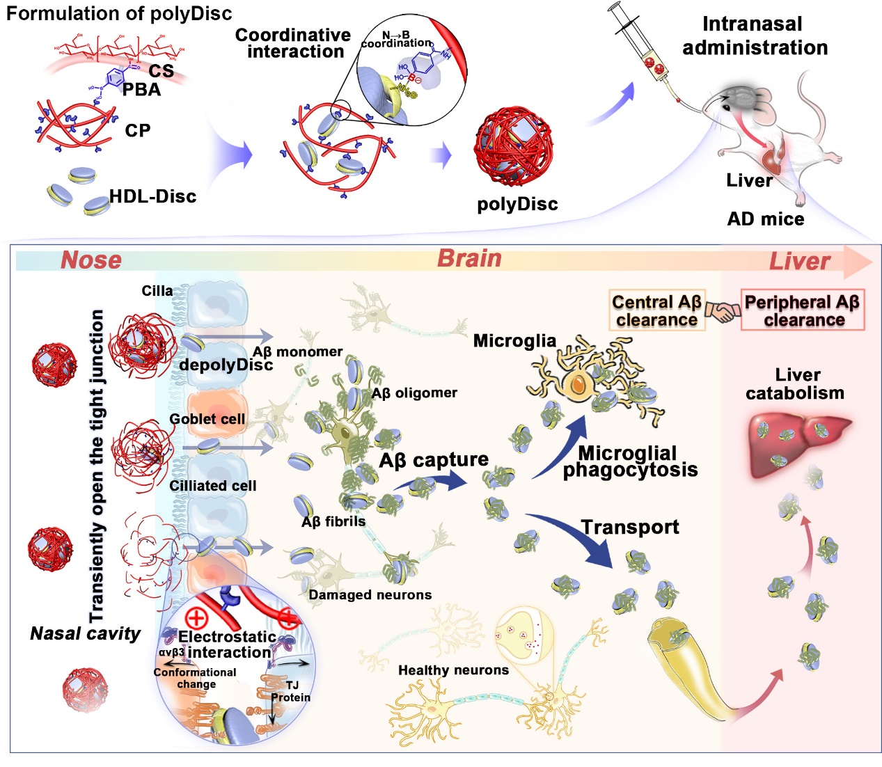 近年,FDA连续获批Aducanumab和Lecanemab两种Aβ抗体药物用于阿尔茨海默症(AD)早期治疗,说明Aβ清除与临床收益存在量效关系,但其应用仍受限于Aβ中枢清除效率不足和脑出血/水肿等不良反应。基于现有Aβ中枢清除策略的应用局限,受天然盘状高密度脂蛋白(HDL-Disc)的Aβ高效运载活力及脑内外转运通路启发,本研究开发了一种“Aβ类抗体”药物HDL-Disc,为绕过血脑屏障和提高脑内药物暴露量,合成了糖基促渗聚合物定向组装HDL-Disc,共建聚合型HDL-Disc(polyDisc)。经鼻给药后,polyDisc响应鼻腔弱酸性微环境解聚,糖基促渗剂可逆开启鼻腔黏膜屏障,加速释放HDL-Disc渗透入脑;入脑后,HDL-Disc“类抗体”亲和捕获Aβ,既能靶向小胶质细胞完成高效中枢清除,又能通过淋巴外排入血富集于肝脏增效外周清除,实现中枢协同外周的Aβ高效代谢。